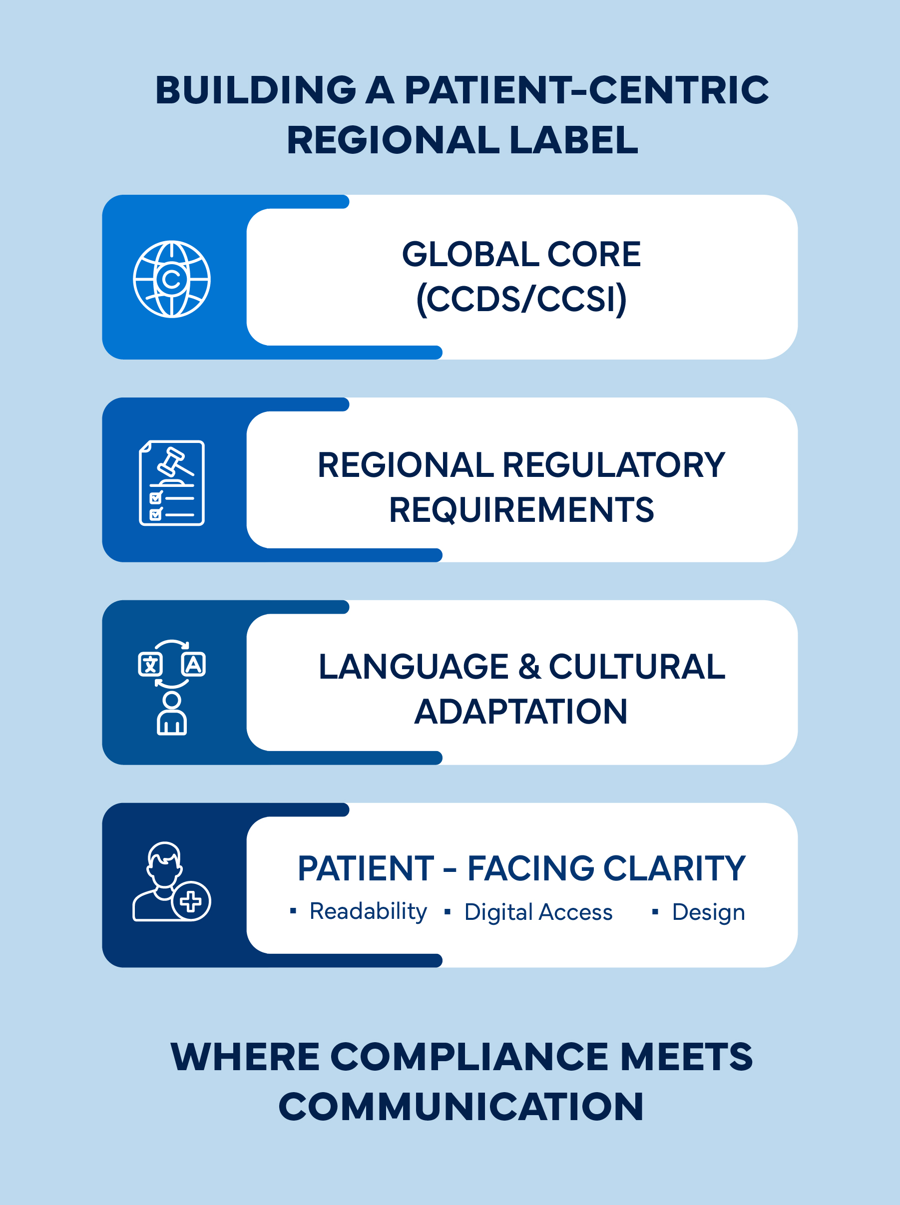 Navigating these dynamic regulations requires integrated regional labeling strategies that align global core data (such as CCDS or CCSI) with local language and content needs, ensuring compliance without compromising clarity.