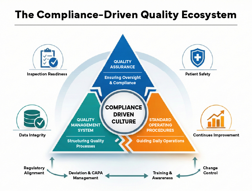 A compliance-driven culture emerges when QA, QMS, and SOPs function as an integrated ecosystem rather than standalone components.