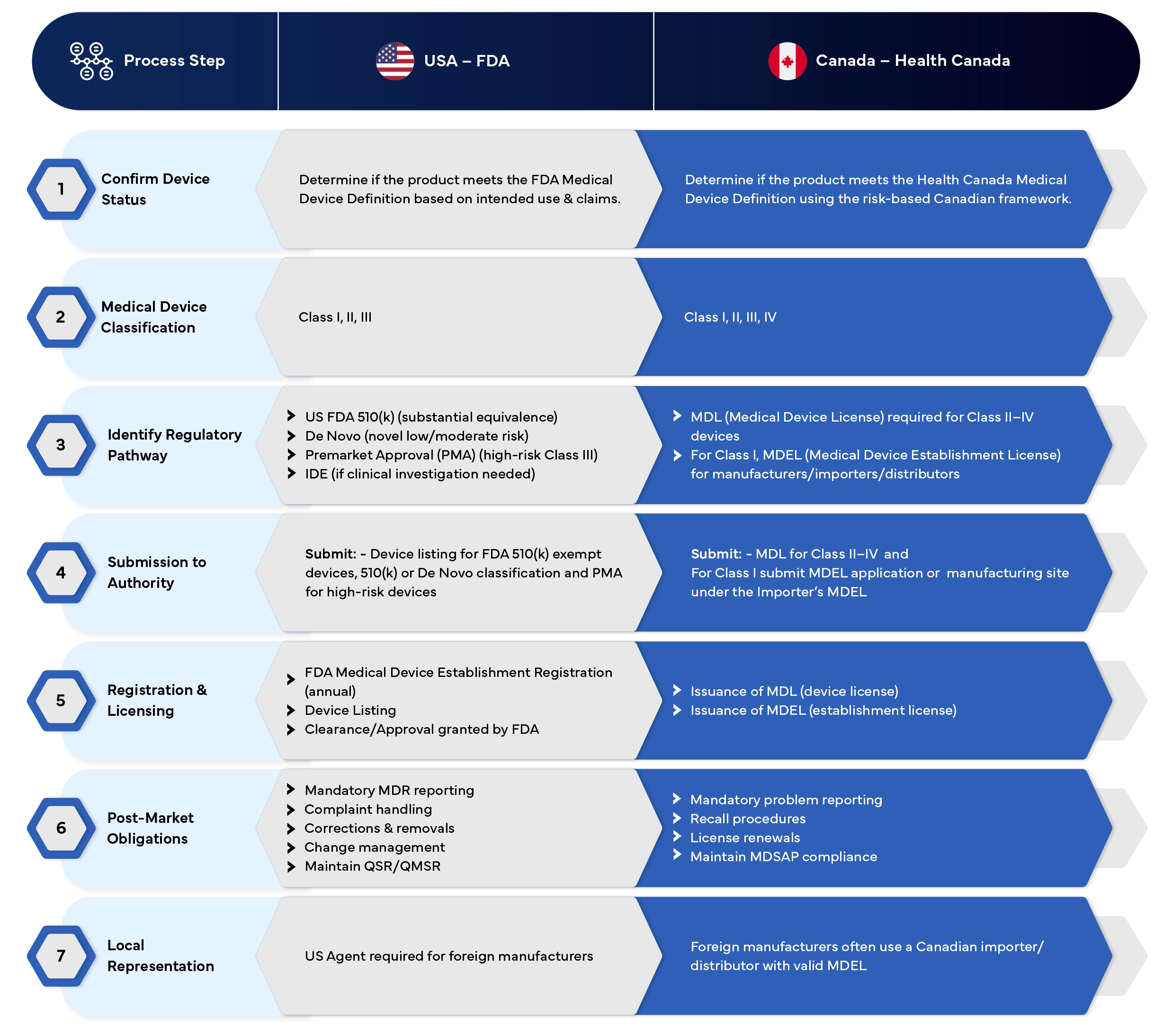 The North American medical device market is one of the most attractive and highly regulated in the world. In the United States, medical device registration is overseen by the FDA, primarily through the Center for Devices and Radiological Health (CDRH), while in Canada, it is governed by Health Canada under a risk-based framework.