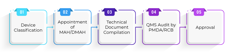 Manufacturers must comply with all the QMS requirements defined under Ordinance 169. The sponsor or DMAH or MAH must apply to the PMDA. The PMDA carries out a detailed QMS inspection of the manufacturer’s facility and issues the certificate upon satisfactory implementation of the QMS.